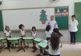 Three priests visited D. Neném School, last Monday, to spread the word on the advent. The group was composed of Father Cesar, chaplain of Pernambuco’s police department, and two Benedictine monks, Dom Marcos and Dom Policarpo. Merry Christmas!